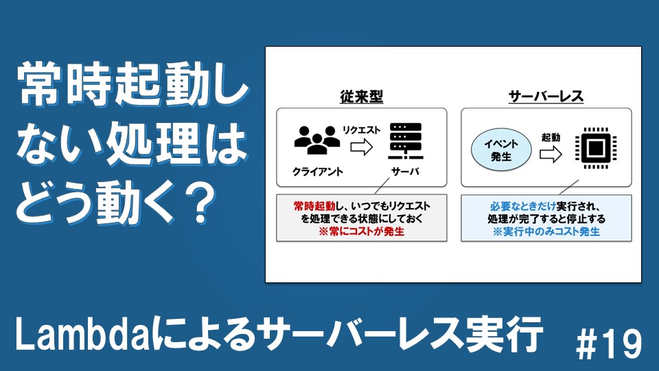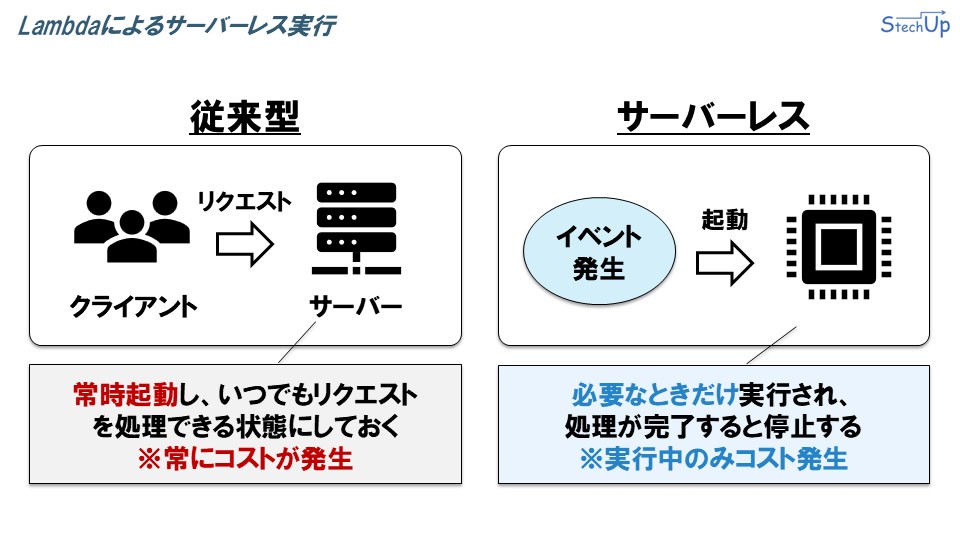 一方、サーバーレスでは、イベントが発生したときだけ実行され、処理が完了すると停止します。