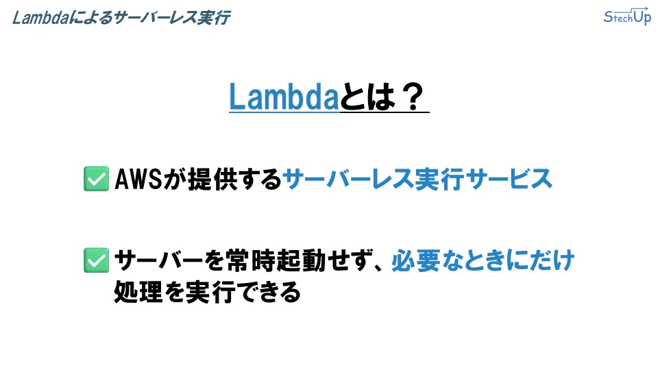 Lambdaとは、AWSが提供するサーバーレス実行サービスです。