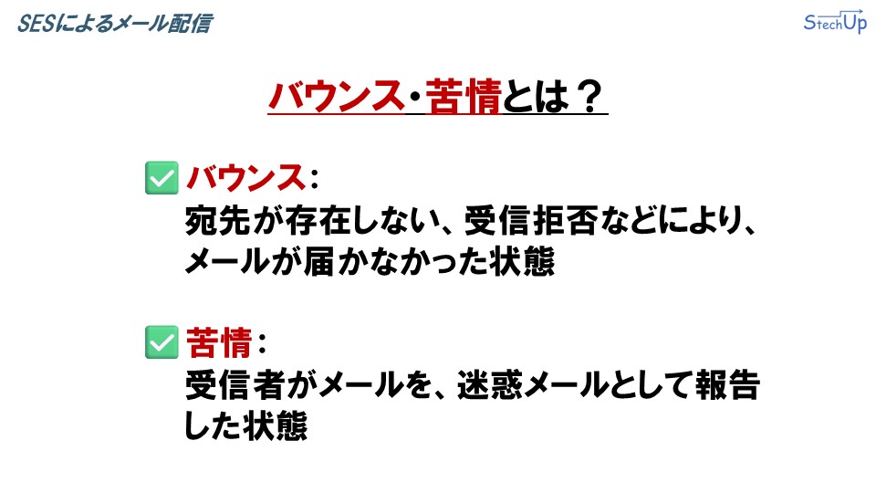 SESを使えば、こうしたバウンスや苦情をイベントとして受け取り、Lambdaと連携して比較的シンプルに対応することができます。