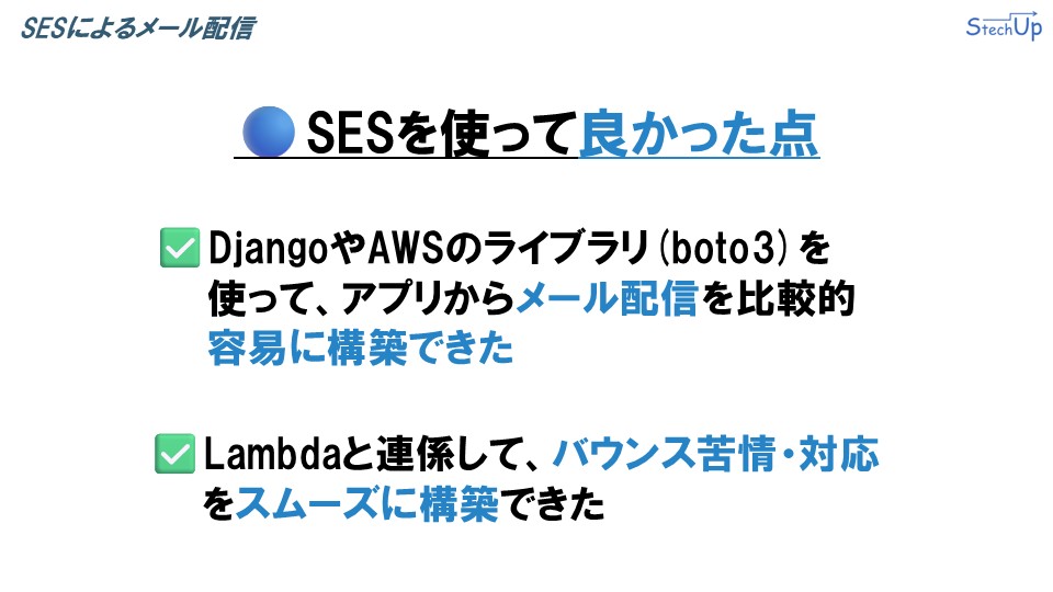 また、Lambdaと連携することで、バウンスや苦情への対応もスムーズに構築できた点が、大きなメリットでした。