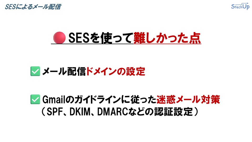 また、Gmailのガイドラインに従った迷惑メール対策として、SPFやDKIM、DMARCといったメール認証の設定を行う必要があり、このあたりの対応が難しかった点です。