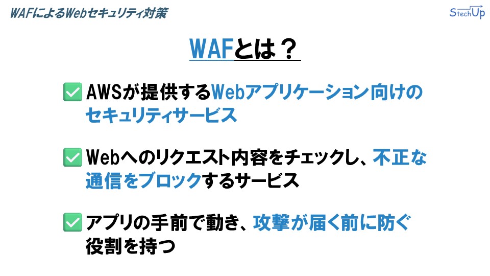 WAFは、Webアプリケーションを守るためのセキュリティの仕組みです。