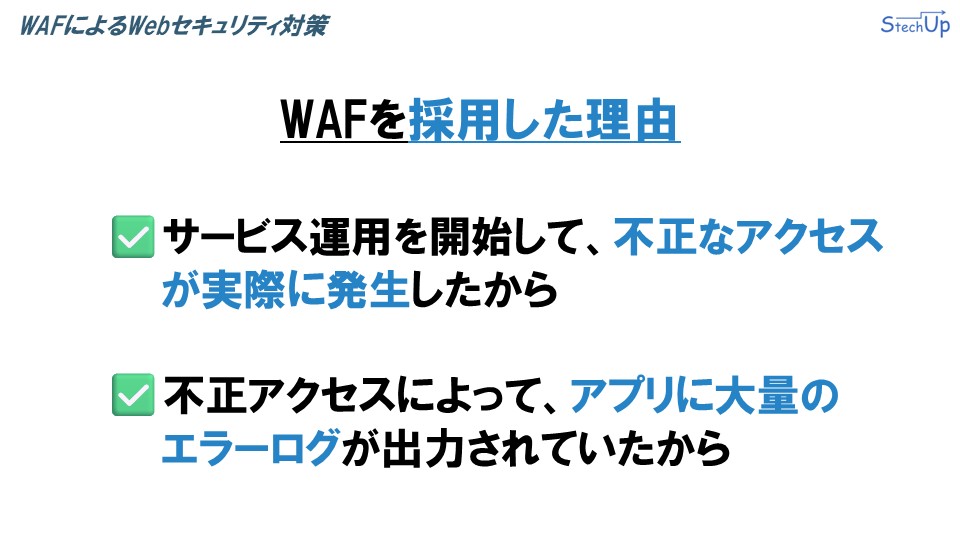 そこで、アプリに届く前の段階で通信を防ぐために、WAFを導入しました。