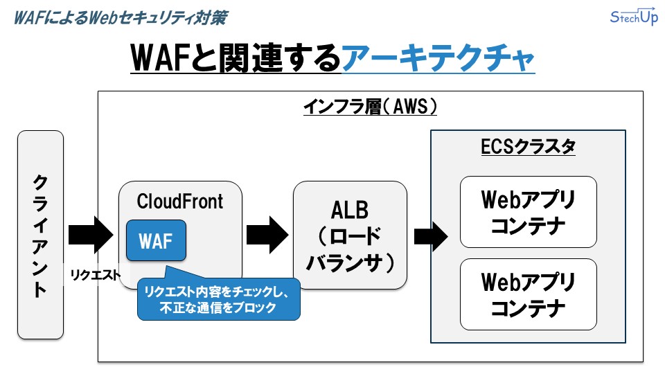 正常なリクエストだけが、ALBを経由して、ECS上で稼働しているWebアプリのコンテナへ届けられます。