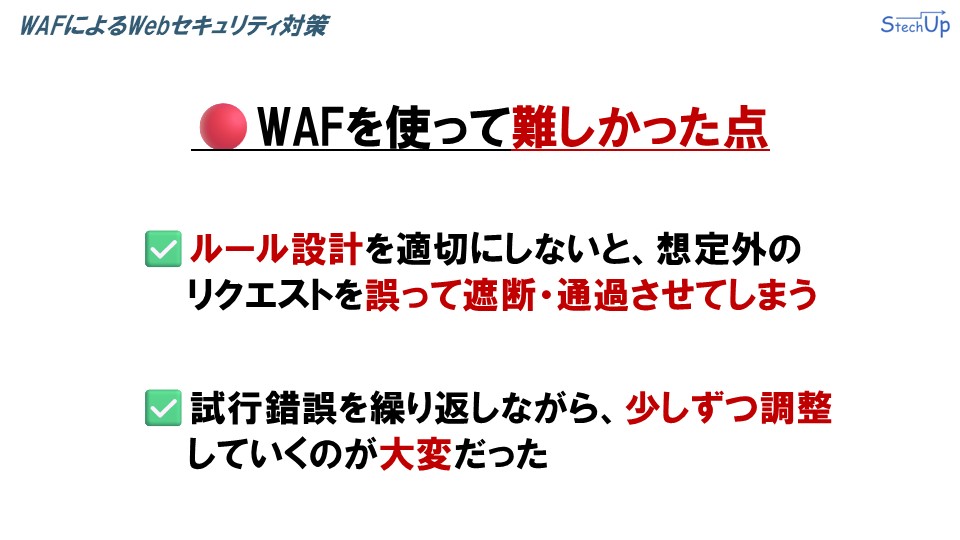 WAFはルールにもとづいて通信を判断するため、設計がとても重要になります。